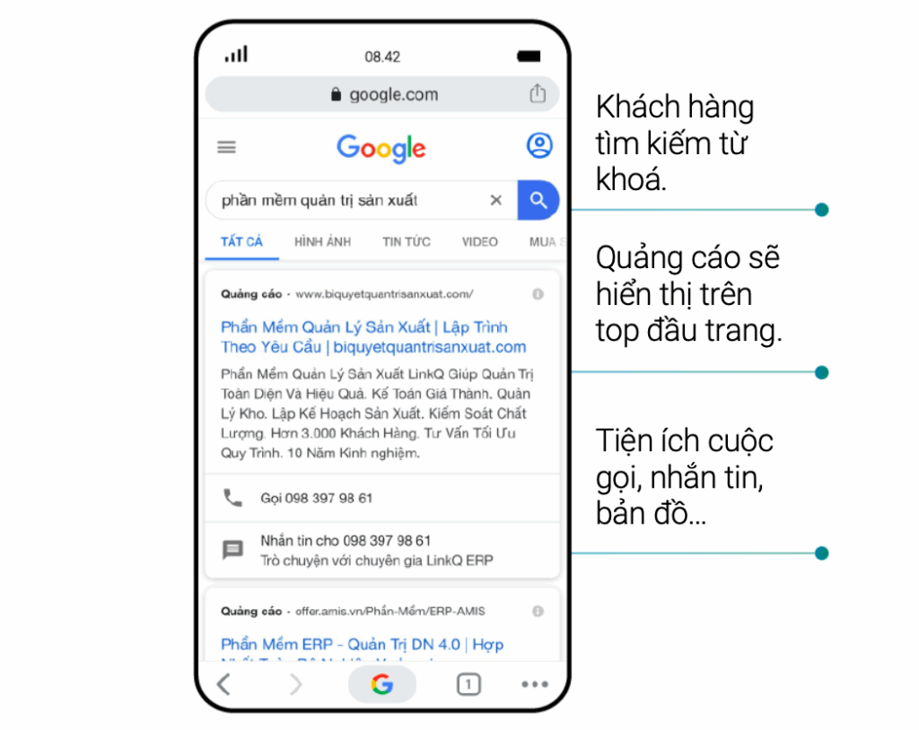 Dựa trên phân tích về chân dung khách hàng tiềm năng và hành trình khách hàng, chúng tôi đã triển khai quảng cáo tìm kiếm trên Google, nhằm đón những khách hàng đang có nhu cầu tìm kiếm về phần mềm quản trị doanh nghiệp đến website.