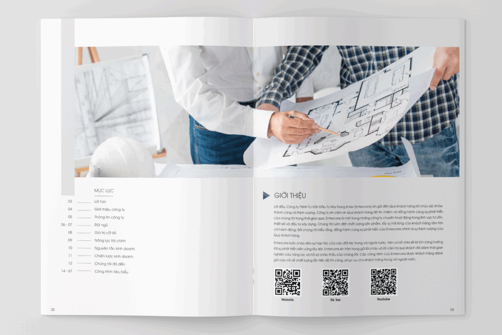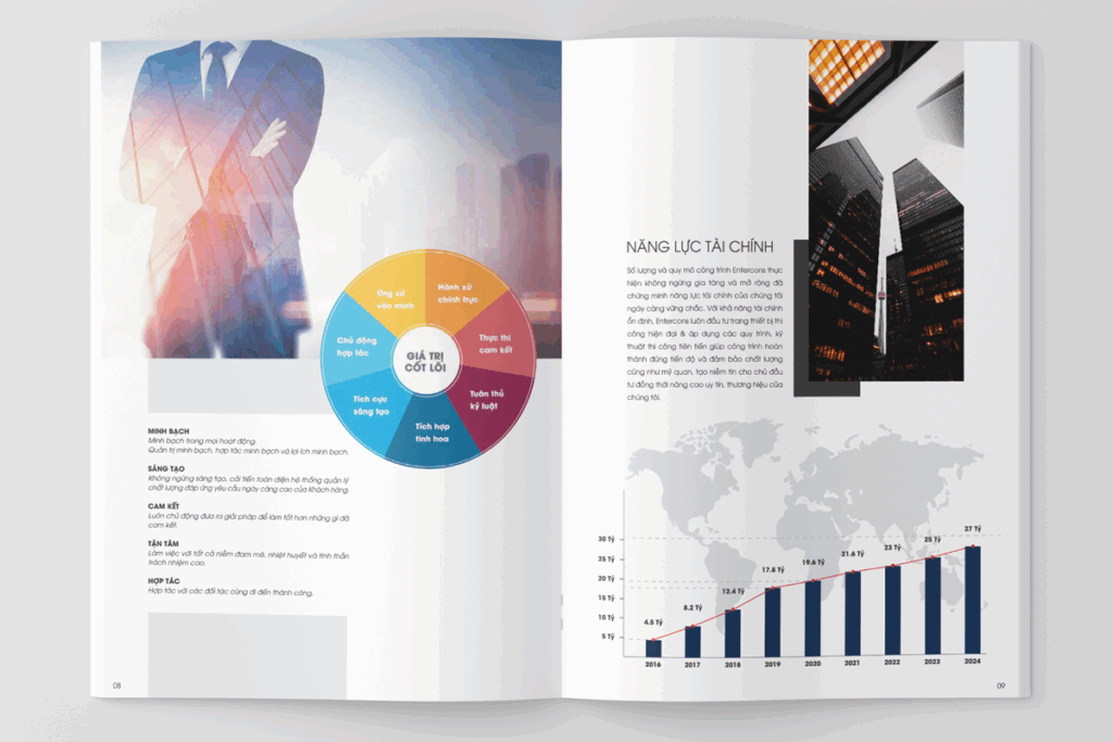 Trong dự án này, chúng tôi thực hiện các đầu việc: Biên soạn nội dung giới thiệu doanh nghiệp, sản phẩm & dịch vụ. Thiết kế hồ sơ năng lực.