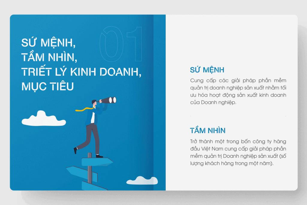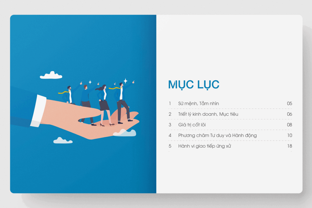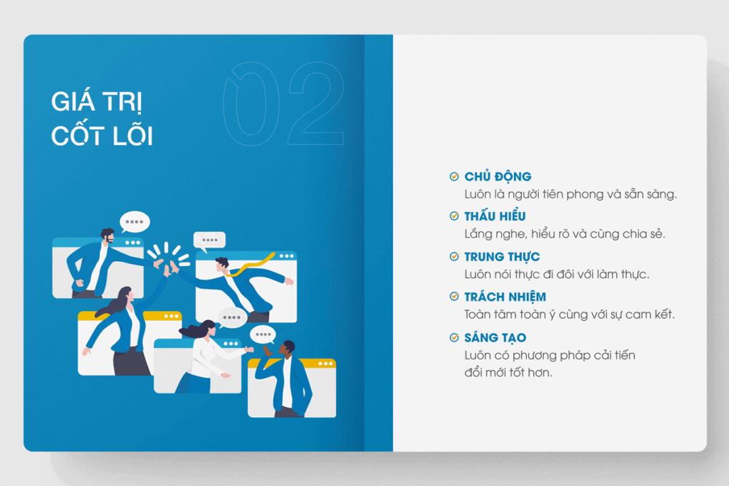 Trong dự án này, chúng tôi thực hiện các đầu việc: Biên soạn nội dung giới thiệu văn hóa doanh nghiệp và thiết kế đồng bộ.