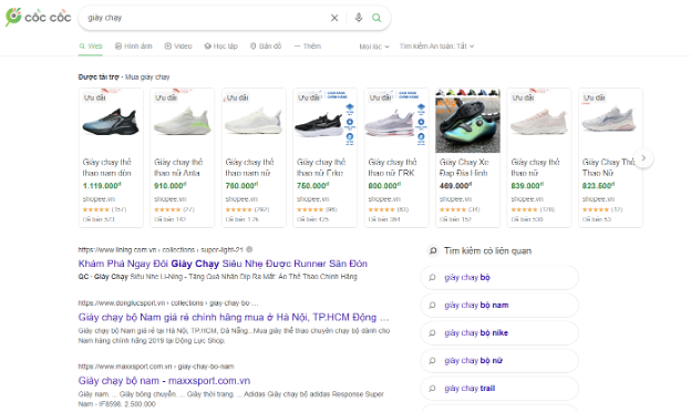 Quảng cáo Tìm kiếm hay quảng cáo Từ khóa hiển thị trên trang kết quả tìm kiếm của công cụ tìm kiếm Cốc cốc hoặc trên trang chủ trình duyệt Cốc cốc khi một người dùng mở tab mới (hiển thị với những người dùng có lịch sử tìm kiếm chứa từ khóa mà bạn đã chọn). Hình thức quảng cáo này chỉ xuất hiện khi có khách hàng sử dụng cụm từ/thuật ngữ tìm kiếm có liên quan đến từ khóa mà bạn đã thiết lập cho quảng cáo. Nhờ vậy, tỷ lệ mua hàng qua quảng cáo cao hơn, và doanh nghiệp bạn cũng không bị lãng phí ngân sách vào những người không có nhu cầu.