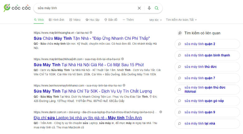 Cốc Cốc Cốc tìm kiếm trên trang kết quả